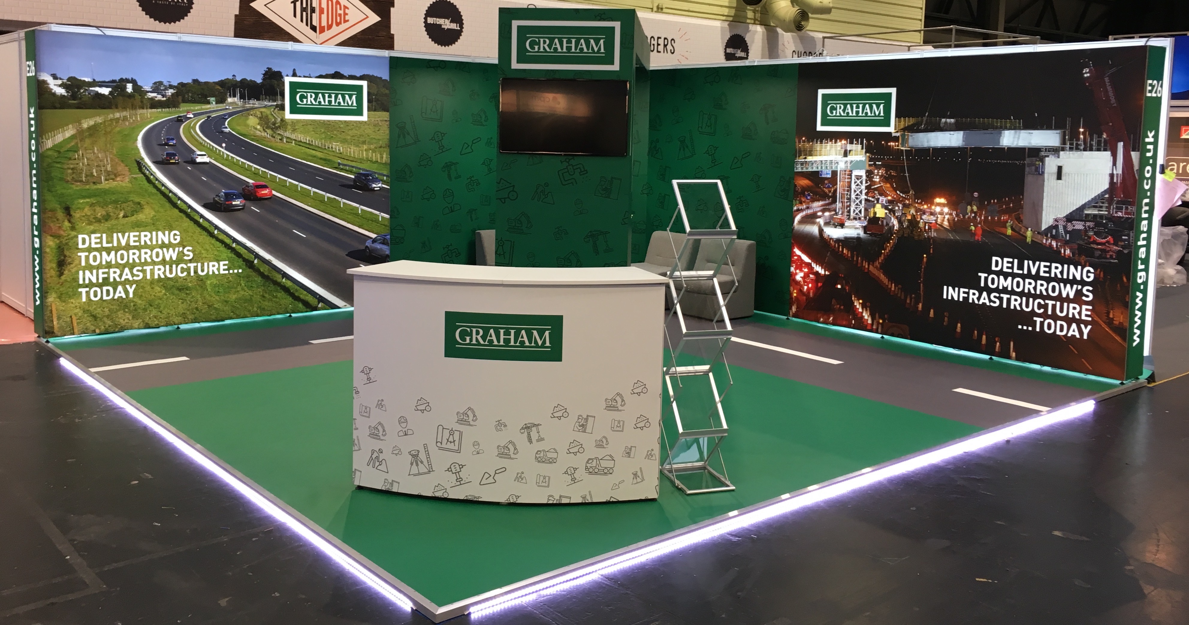 Today at the NEC we completed a 6×6 meter exhibition stand for Graham Construction. The stand showcases some of the best features available with a modular display system: Backlit Fabric Lightboxes – Triple layer print helps these graphics punch out with LED backlight Twist-Lock Frame – Rapid tool free assembly in a modular system Raised Floor – Custom …